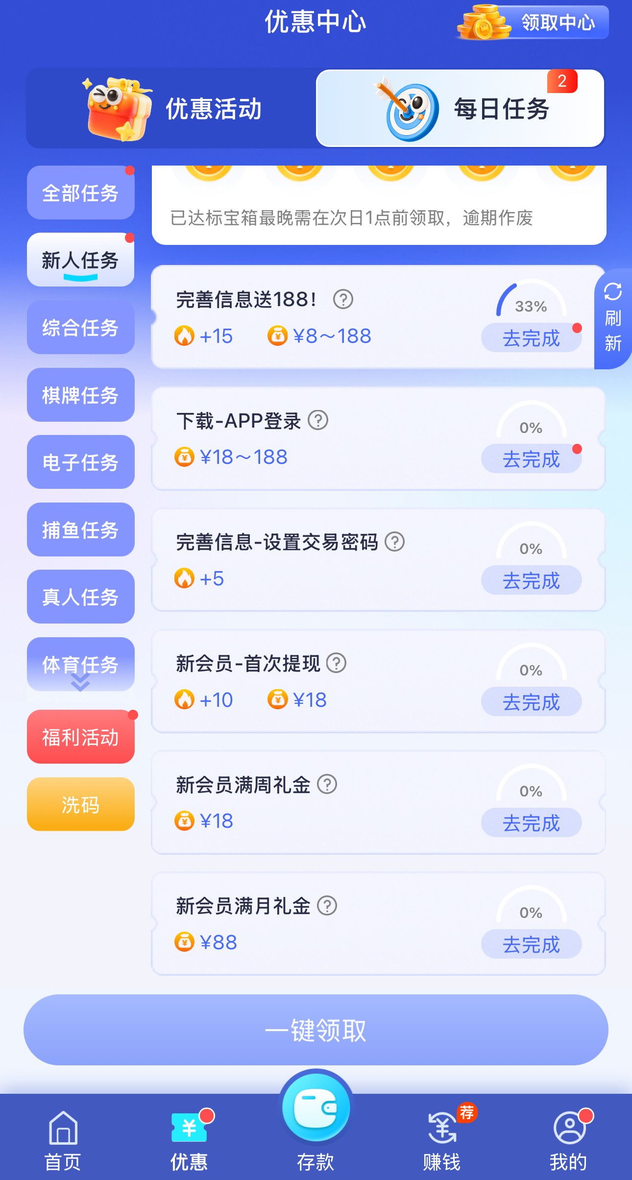 新用户注册绑卡完善所有资料,点击优惠-每日任务里面自助领取