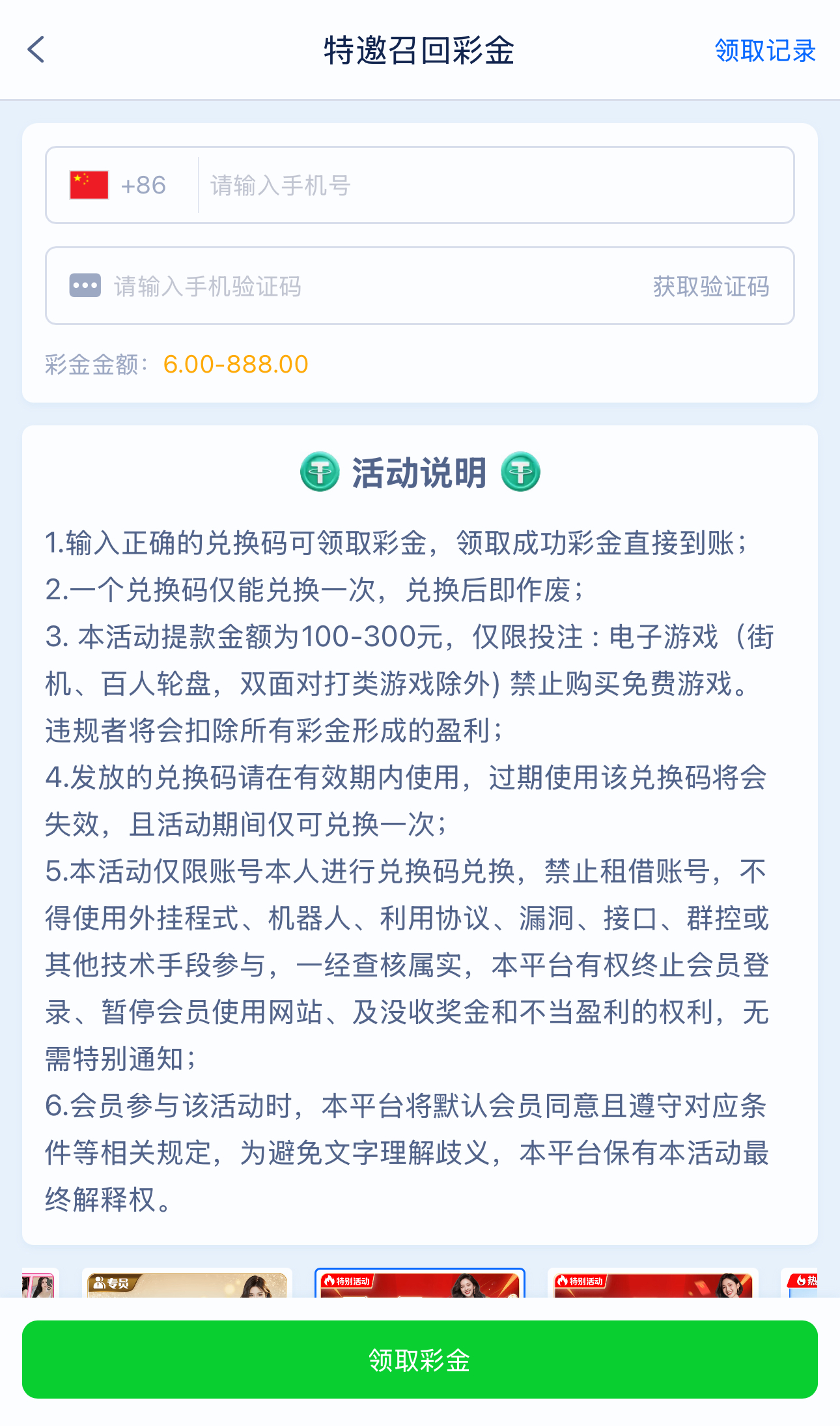 碰瓷特邀召回彩金,老用户有账号的去登录优惠大厅页面自助填写手机号碰瓷召回彩金